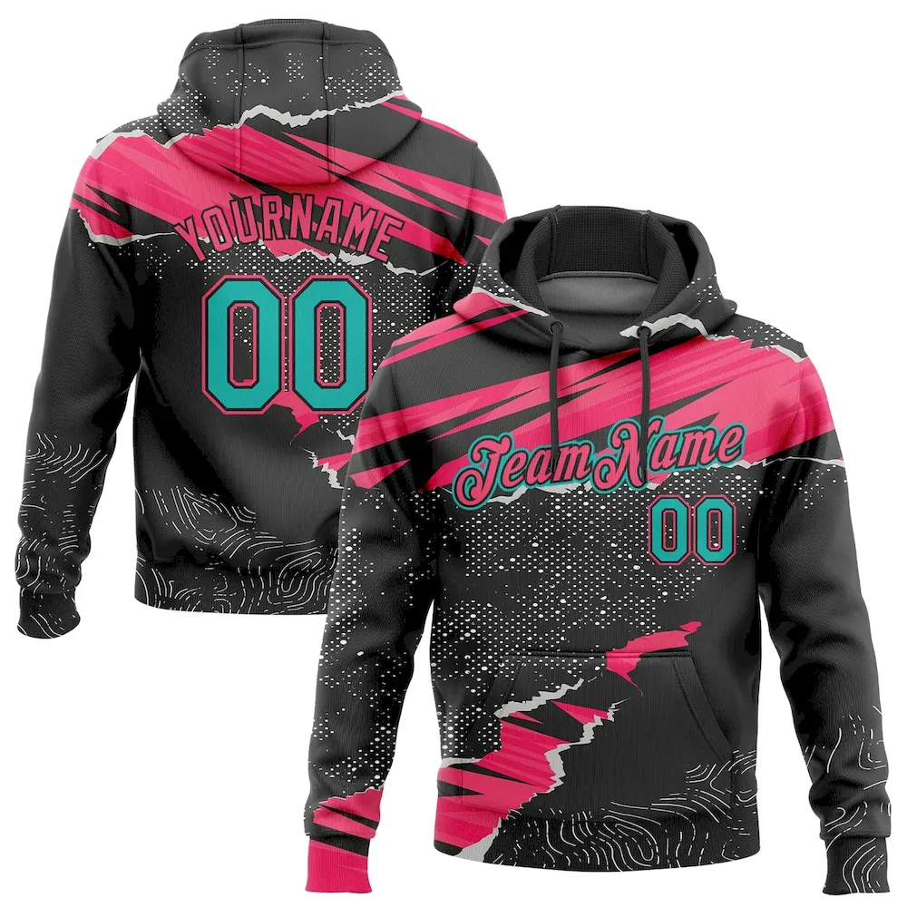 Custom Stitched Black Aqua-Neon Pink 3D Pattern Design Torn Paper Style Sports Pullover Sweatshirt Hoodie